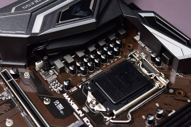 接下来我们就来看看铭瑄B460M电竞之心在供电以及芯片上的用料。首先就是供电,铭瑄B460M电竞之心采用了6+1+1相供电。其中CPU供电总共六相,采用1上2下设计。剩余的亮相供电分别为1相VccIO/SA以及一相核显供电。