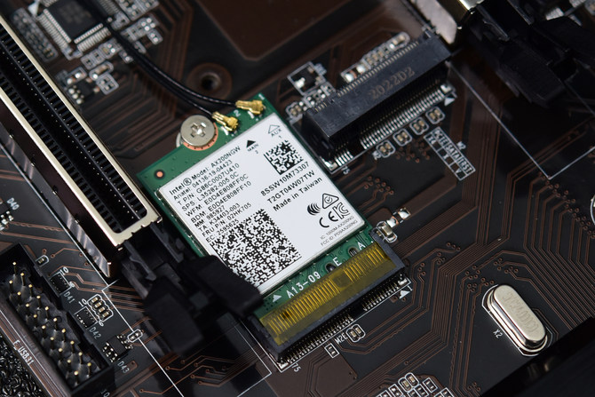 此外,铭瑄B460M电竞之心还内置Intel AX200系列WiFi6无线网卡,其支持802.11ax协议,也就是俗称的标准WiFi6协议,并集成蓝牙5.1模块,支持5GHz/2.4GHz双频和多用户2x2MIMO(MU-MIMO),WiFi6环境下可获得2.4Gbps的峰值带宽,简单来讲就是如果你家里使用WiFi6的路由器,这块板子的无线网络速度可以比有线网络快。