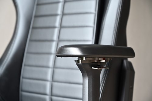 扶手部分宽大柔软,可通过三个按钮拨块进行4D多向调节,除了高低前后、左右平移外,还可进行15°的旋转,满足各类用户的不同使用习惯,总有一个合适的角度来安放手肘部位。