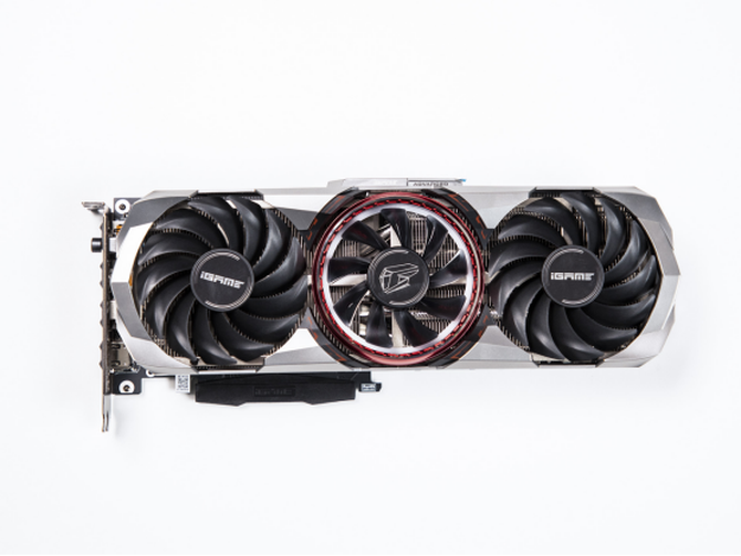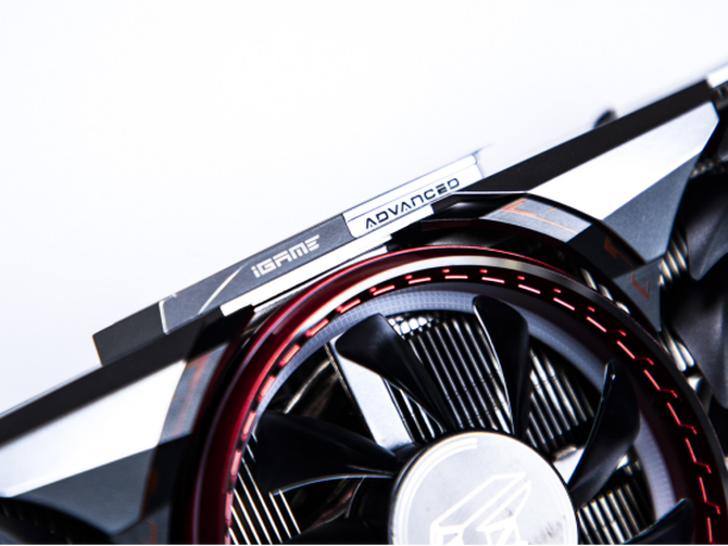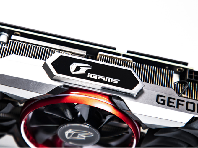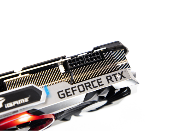 显卡的顶部同样是一个支持RGB灯效的炫彩“iGame”品牌标识,同时显卡采用了双8pin的供电接口。