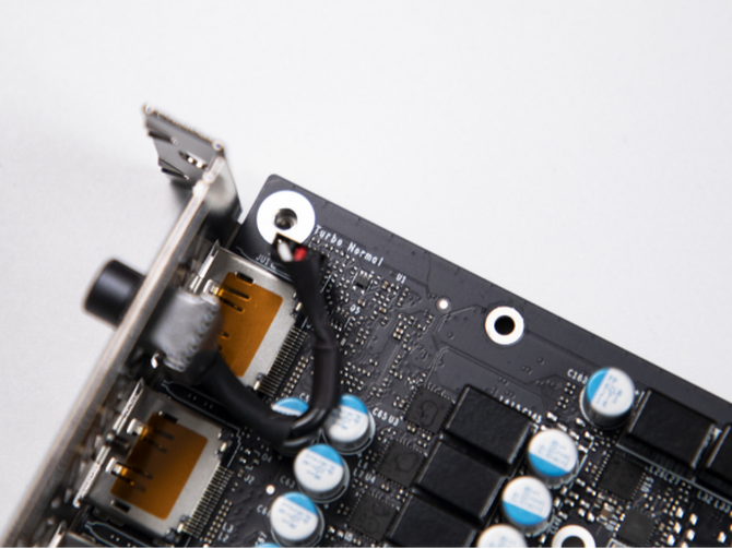 显卡的PCB板左上角是显卡的一键超频开关排线。