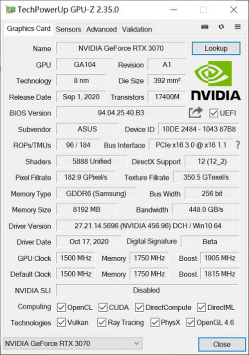 驱动版本号为459.96,测试系统为Win10 1903更新至较新版本,显卡频率的话我们默认开启一键超频,频率为1815MHz,以下的测试成绩均为1815MHz频率所得,如果想要查看公版成绩的话,可以参照公版评测。