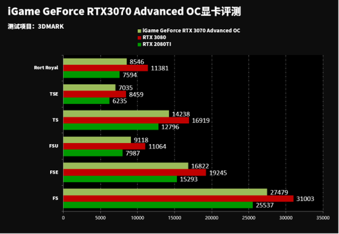 首先我们看下显卡的基准性能测试,在3DMARK各项测试中,iGame GeForce RTX3070 Advanced OC游戏显卡成绩均领先RTX 2080TI,领先的幅度大致在12.5%左右,如果是公版的1725MHz频率的话,领先幅度大致在7.5%左右,性能和官方宣称的基本一致,基本和上代旗舰级的RTX 2080TI接近,并且大幅度领先。