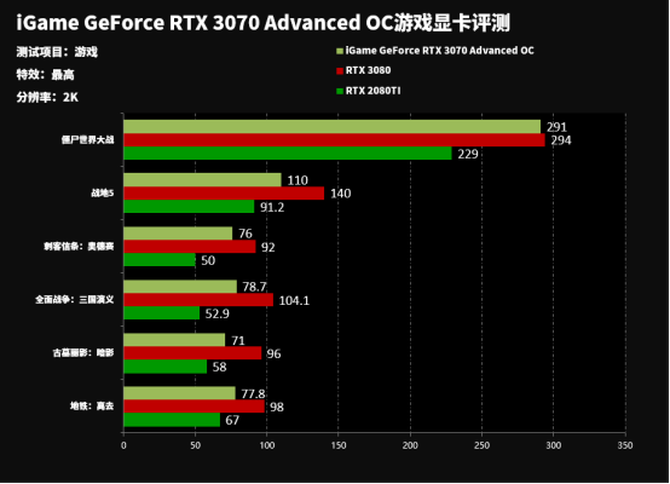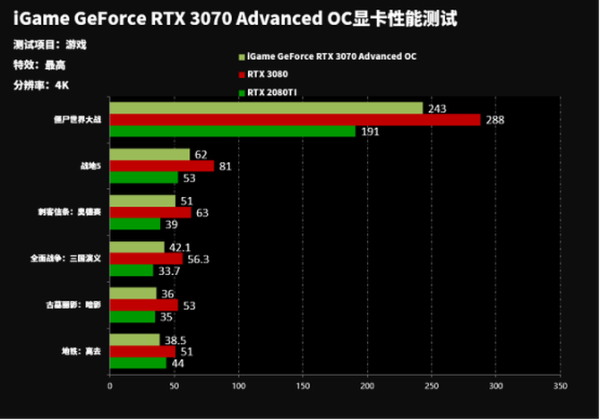 在4K游戏方面,我们可以看到,除了僵尸世界大战突破百帧频率之外,其他的几款游戏帧数,只能达到30帧流畅游戏的要求,但是在战地5这款游戏中,RTX 3070游戏显卡拥有非常出色的游戏画面,同时在开启光线追踪的情况下,游戏的画面精美,光影效果出色,整体的游戏体验完全媲美电影级的影音效果。