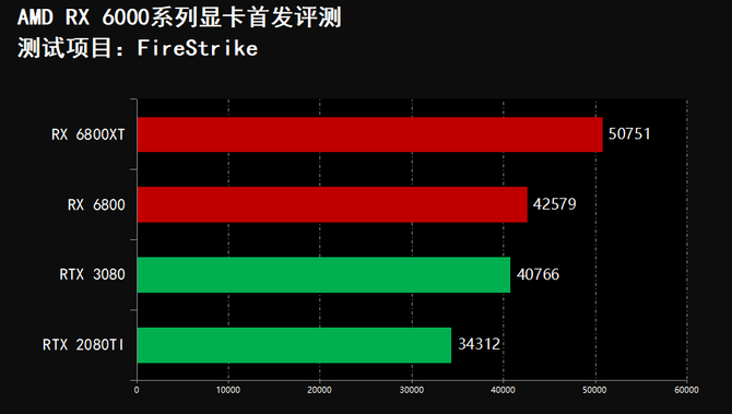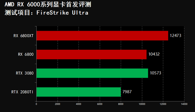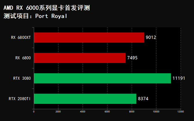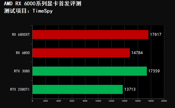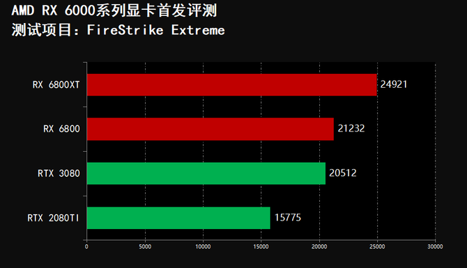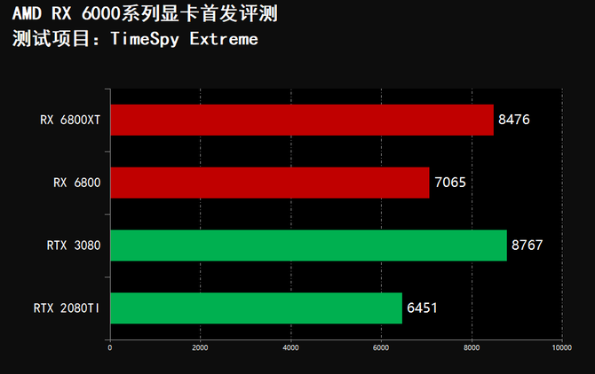 在3DMARK项目中我们可以看到,RX 6800XT显卡的跑分全面领先RTX 3080和RTX 2080TI,RX 6800显卡跑分全面领先RTX 2080TI,并且在FireStrike和FireStrike Extreme项目中,RX 6800显卡的分数领先RTX 3080显卡,实现了性能越级吊打,综合性能表现非常突出,但是在游戏光追项目中,RX 6000系列显卡不敌RTX 3080和RTX 2080Ti光追性能。