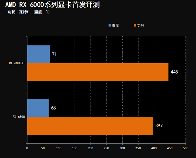 这次的AMD RX 6000系列显卡的功耗优异让我们眼前一亮,RX 6800XT的满载功耗大约为445W,拷机温度为71℃,而RX 6800显卡的满载时候平台的功耗为397W,温度为68℃,得益于7nm制程和RNDA 2架构的优化,Nvai 21核心的功耗比相对于上代提升50%以上,并且显卡的整体功耗表现要优于RTX 3080和RTX 2080TI,整体表现非常出色。