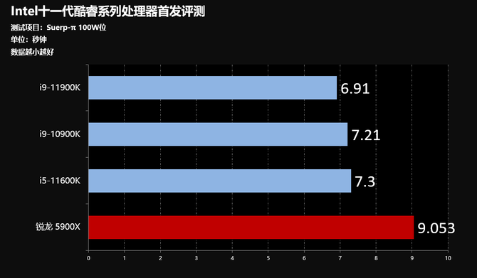 在Super-π测试环节中,i9-11900K的单核心性能来到恐怖的6.93秒,这也是i9级别的处理器首次破7秒钟,单核性能相对于上代i9-10900K有了大幅提升,同时i5-11600K的成绩同样表现出色,单核心性能均大幅领先锐龙5900X处理器。