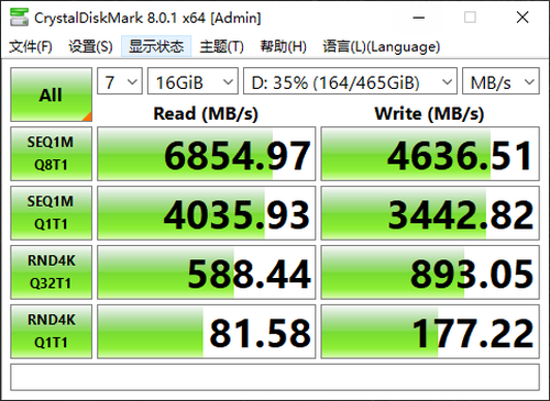 在硬盘性能方面,全新的十一代酷睿处理器支持PCIe 4.0,经过我们实际的测试可以看到,硬盘的顺序读取为6854.97MB/S,对于大部分的应用来讲,基本可以实现秒开,尤其是在游戏方面的表现,绝对惊艳,我这里强烈推荐用户直接上PCIe 4.0硬盘,提升真的不是一点半点。