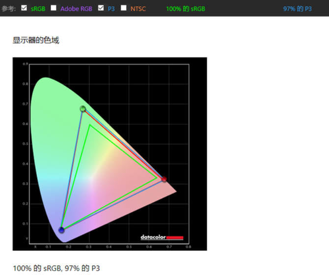 ↑P3色域模式下画面更生动,调色工作的话可以切换到100% sRGB模式