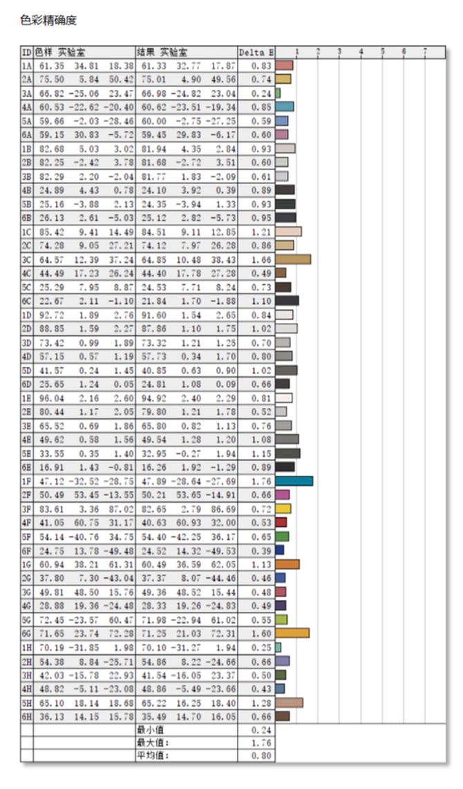 资料显示华为MateView在产线上,使用的是46张色卡的色彩校准,这里使用较色仪的48色模式进行测试。ΔE值在1.6到之间3.2,人眼基本上是分辨不出色彩的差异,一般专业级显示器要达到这个数值。而多次测量的结果来看,华为MateView拥有足够稳定的色彩还原度。