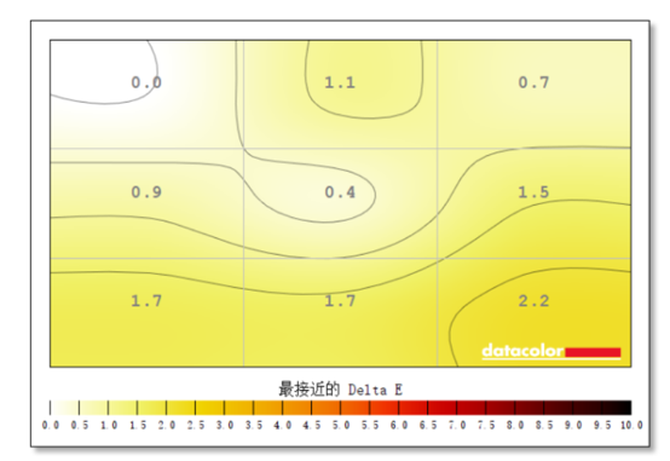 大尺寸显示器的色彩均匀表现很重要,华为MateView达到了28.2英寸,这里也进行了相关测试。从校色仪读取的数据来看,这块屏幕的各个区域的色温与标准值都比较接近,眼睛很难分辨到其中的变化。