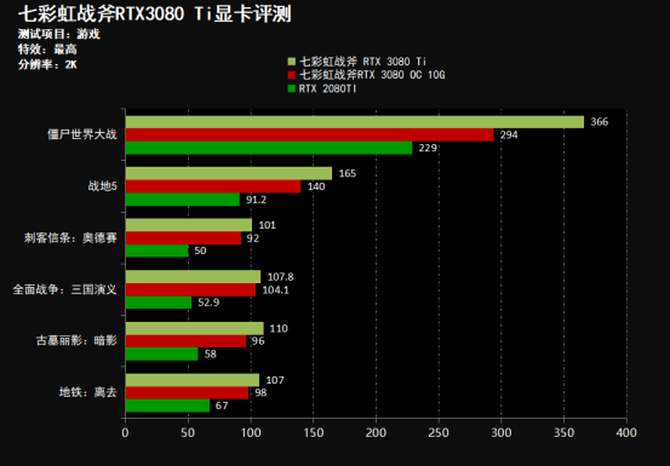 在2K游戏测试环节中我们可以看到,七彩虹战斧 GeForce RTX 3080 Ti能够在2K分辨率下轻松畅玩各种3A大作,均能达到破100帧的游戏帧数,达到绝对流畅运行游戏的要求,对于玩家来讲的话,这样的成绩表现非常优秀,性能远超RTX 3080和RTX 2080 Ti。