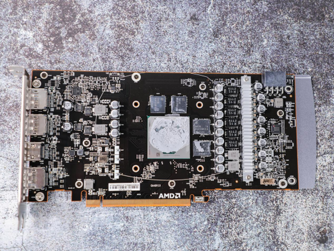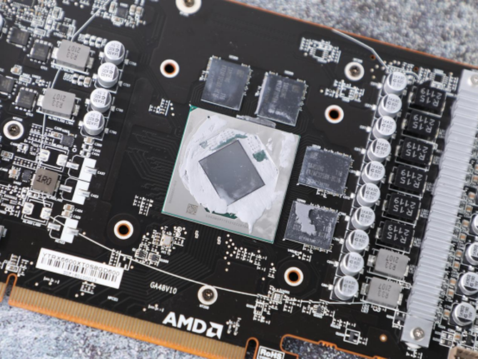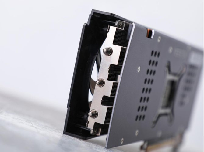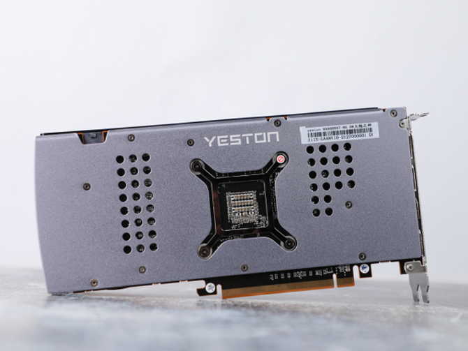 全金属的背板设计,加上两侧的开孔,让显卡正面风扇的风能够轻松穿过显卡,带来更好的散热效果。标志性的显卡核心,让我们一眼就能看出这是一款A卡。