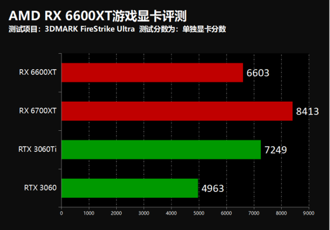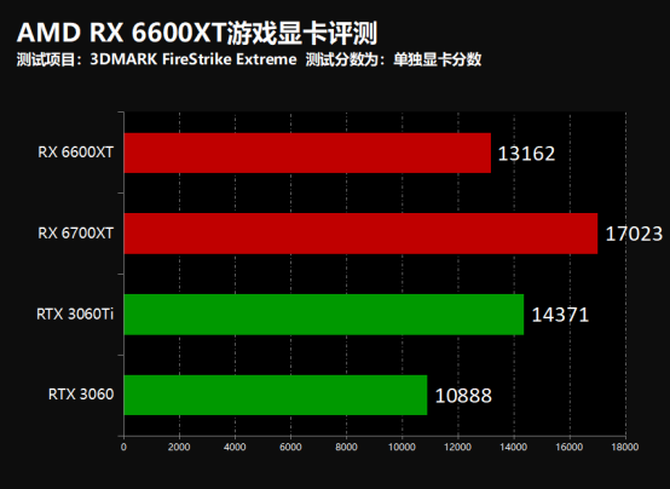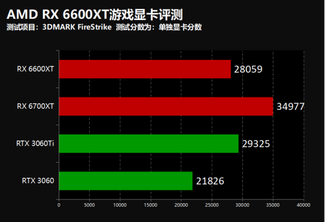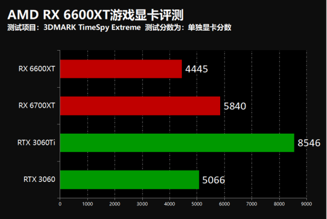 3DMARK项目中我们可以看到,在TImeSpy项目中,RX 6600XT显卡的性能要明显强于RTX 3060,在模拟1080P的FireStrike项目中,RX 6600XT性能和RTX 3060TI基本保持一致,性能表现出色。