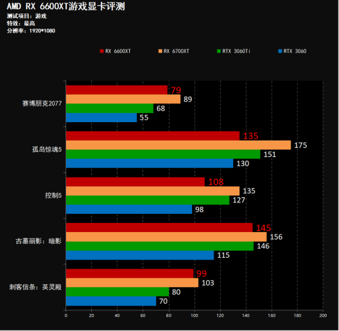 游戏测试环节中,我们可以看到,在五款目前主流的3A游戏大作中,RX 6600XT都以绝对的优势领先RX 3060显卡,并且在刺客信条这款游戏中,RX 6600XT领先RT 3060TI超过19%,游戏性能表现非常优秀,尤其是在DX 12的游戏中,RX 6600XT有着非常明显的优势。