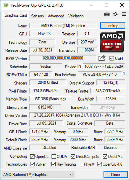 核心部分同样采用了Navi21核心,流处理器共2048个,光线加速器为32,晶体管数量为11.1B,同时基础频率为1968MHz,最大加速频率可以达到2589MHz,游戏频率可以达到2359MHz。