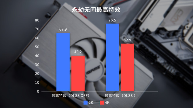 在2K分辨率下,开启最高特效后《永劫无间》的帧数可达67.9帧,达到了流畅运行水平。而在4K的超高分辨率下,即便是特效全开的情况也能够稳定维持在40帧左右。当然作为一款武侠动作游戏,更高的帧数利于玩家在战斗当中发挥出高水平操作。玩家可以开启DLSS功能获得进一步的游戏体验,在2K分辨率的最高特效之下,可由原先的67.9帧提升至76.5帧;而开启4K分辨率最高特效,由40.2帧提升至52.9帧,DLSS的开启将大幅提升游玩体验。