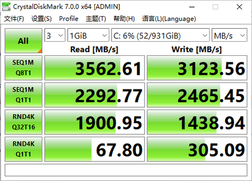 首先我们较为熟悉的CrystalDiskMark 7.0,经过我们的实际测试硬盘的顺序读取性能高达3562.61MB/S,顺序写入性能高达3123.56MB/S,性能表现非常出色,基本达到了PCIe 4.0硬盘的满速,相对于上代SN550提升超过40%,是目前西部数据最强的蓝盘SSD。