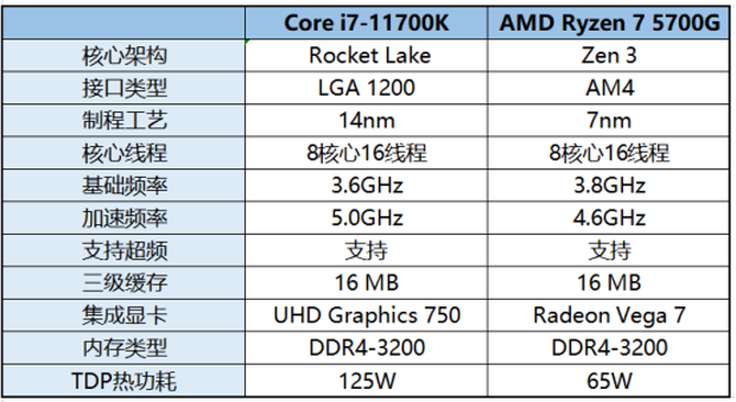 首先我们先来看一下两款处理器的参数,在核心规格方面,两款处理器基本一致都是8核心16线程,但是在工艺制程方面,AMD Ryzen 7 5700G采用了最新的7nm工艺制程,使得其TDP仅为65W,通过包装内自带的幽灵散热器就能稳稳压住,而i7-11700K这边的话,就需要用户额外购买性能更强的散热器了,这充分体现了锐龙处理器的7nm制程优势。