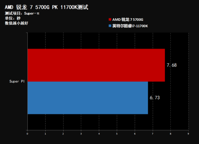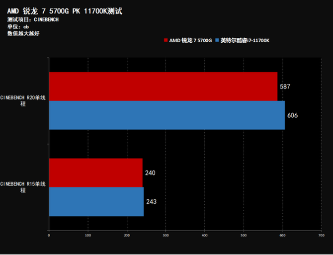在单线程性能测试成绩方面我们可以看到,AMD 锐龙 7 5700G整体和Intel酷睿i7-11700K相差无几,单核性能基本保持一致。