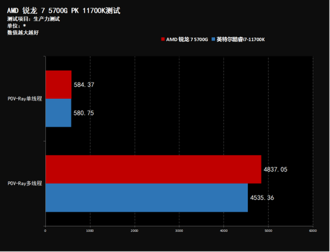 在POV测试中,锐龙 5700G的多线性能明显领先Intel酷睿i7-11700K,而单线程性能也有略微领先,整体表现较为不错。