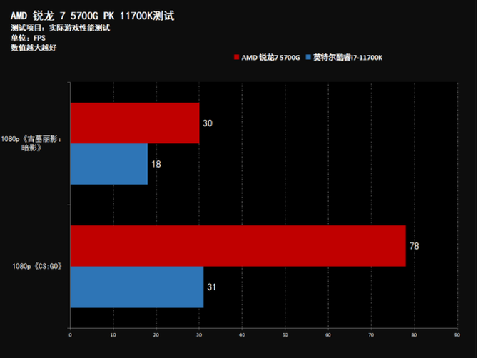 实际游戏性能测试,我们选择了古墓丽影和CS:GO进行测试,我们可以看到在高特效下,5700G能够流畅运行古墓丽影:暗影这款游戏,而Intel酷睿11700K的核显只能运行PPT,卡顿的不能玩,而在CS:GO这款游戏方面,最高特效下,平均游戏帧数可以达到78左右,游戏画面流畅,而11700K核显基本不能玩。