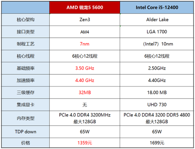 今天我们正好借着近期小伙伴们装机的事情,来跟大家分享一下5000元装机究竟选什么样的处理器比较好,今天参赛的两位选手分别是AMD锐龙5 5600和Intel酷睿12代i5-12400,作为今年全新上市的中端主流级别的游戏处理器,AMD锐龙5 5600在上市之前就饱受期待,并且千元左右抢眼的价格,让专门喜爱游戏的玩家有了更好的选择,在性能架构方面,AMD锐龙5 5600延续了AMD Zen3架构的设计,并且性能表现更加出色,凭借更大的L2+L3缓存容量,配合上更高的处理器频率,让AMD锐龙5000系列的网络游戏性能表现更加抢眼,反观Intel这边的异架构设计,十二代酷睿i5即便采用了新的Intel7制程,但是实际还是10nm工艺,而L2+L3缓存也是仅为够用,加上Intel这边又更换了LGA1700接口,主板的价格又非常高,对于DIY玩家来讲不是那么地友好,怎么看,AMD锐龙5 5600在这个时间点发布,都精准地切合了主流网络游戏玩家的真实需求,性价比非常亮眼。首先我们看看两款处理器的规格参数部分。
