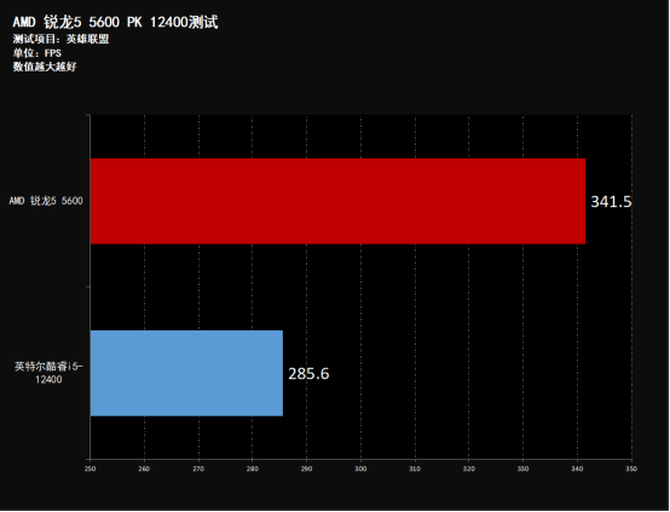 首先是英雄联盟这款游戏,作为一款极为经典的5V5MOBA类游戏,每年的S级赛事更是LOL粉丝一年一度的狂欢,作为极具代表性的网游之一,在实际的测试环节中,AMD锐龙5 5600的游戏帧数为341.5,领先英特尔酷睿12代i5-12400约56帧,领先幅度非常大。