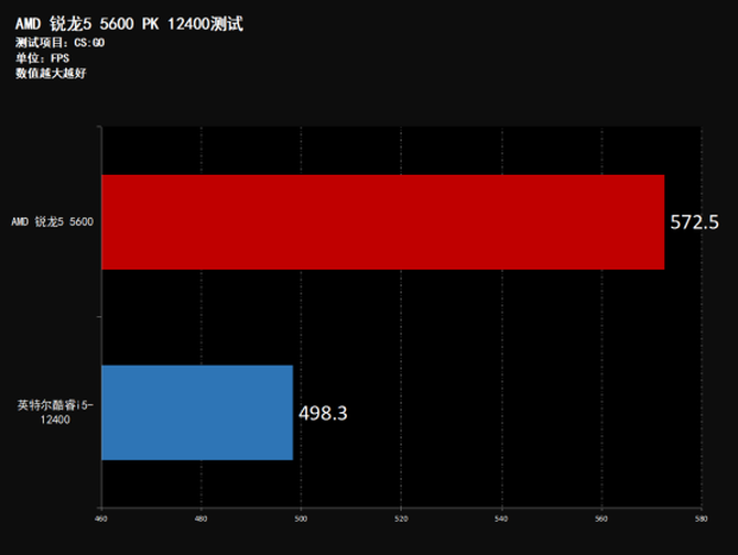 CS:GO作为经典的FPS游戏,并且拥有多项世界顶级的电竞赛事,游戏玩家数量常年在Steam平台上名列前茅,对于游戏帧数的要求更高,在这款游戏中我们可以看到,AMD锐龙5 5600处理器领先Intel酷睿12代i5-12400约74.2帧,领先幅度约14.8%,性能表现更加优秀,能够带给顶级的游戏玩家更加丝滑流畅的游戏体验。
