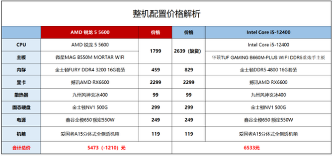在这里我们整理了两套配置基本保持一致的整机配置单,从配置上我们可以看到,在三大件保持一致的情况下,AMD锐龙5 5600竟然要比Intel酷睿i5-12400便宜了1210元,并且在网络游戏方面,AMD锐龙5 5600基本还是吊打Intel酷睿12代i5-12400处理器的,所以对于近期想要装机的用户来讲,肯定用脚投票都知道该如何选了。