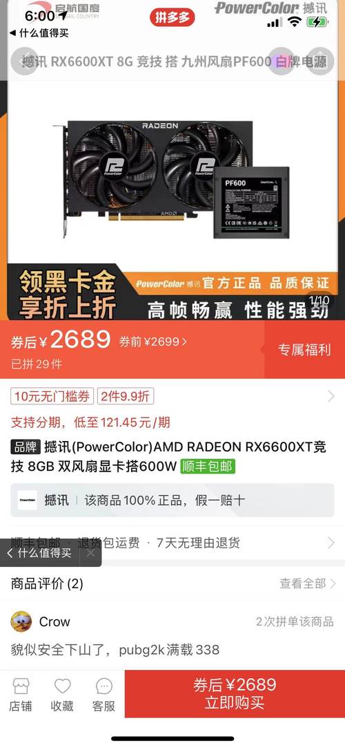 作为AMD全新的6000系列显卡,性能相对于上代有了大幅提升,游戏来讲的话,能够在2K分辨率下畅玩各种类型的游戏,并且价格方面也不错,同时由于是新卡,所以相对来讲,不用过于担心矿卡的问题。