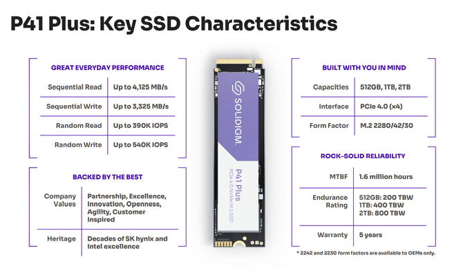 全新的P41 Plus SSD支持PCIe 4.0,采用144层的3D NAND,支持M.2接口,提供2280、2242、2230等多种外形规格,顺序读取速度4125MB/s,顺序写入速度3325MB/s,随机读取390K IOPS,随机写入540K IOPS。平均无故障工作时间(MTBF)160万小时,耐力评级,512GB: 200 TBW;1TB: 400 TBW;2TB: 800 TBW。提供5年质保。