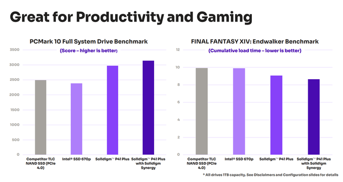作为Solidigm公司首款消费级产品,P41 Plus拥有极高的性价比,可以更好适应日常工作、游戏等各个方面的需求。数据显示,在生产力方面,PCMark 10的测试中,Solidigm P41 Plus相比竞争对手的成绩高出约16%,在《最终幻想 14》游戏的加载时间也比竞争对手,以及Intel SSD 670p的时间都要更低。