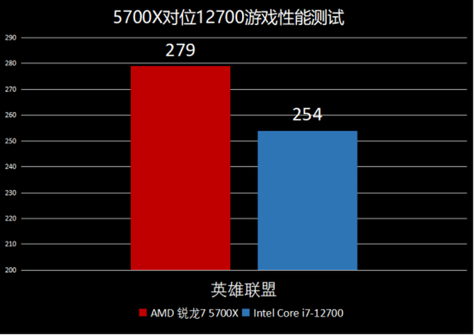 首先是英雄联盟这款游戏,在1080P分辨率下,特效最高,最终的AMD锐龙 7 5700X的游戏帧数为279,Intel酷睿i7-12700的游戏帧数为254,锐龙 7 5700X领先25帧,领先幅度明显。
