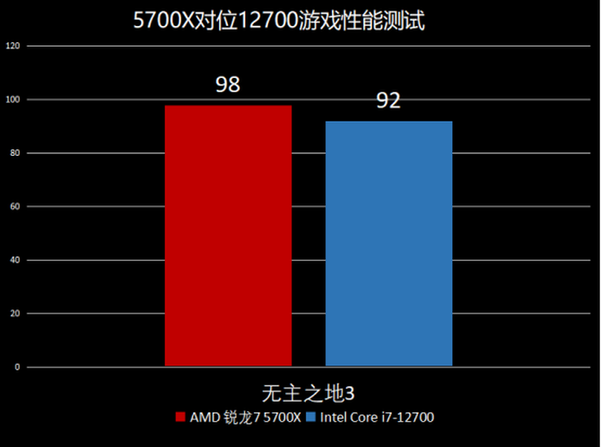 在无主之地3这款游戏中,AMD锐龙 7 5700X的游戏帧数为98,而Intel酷睿i7-12700的游戏帧数为92,领先6帧。
