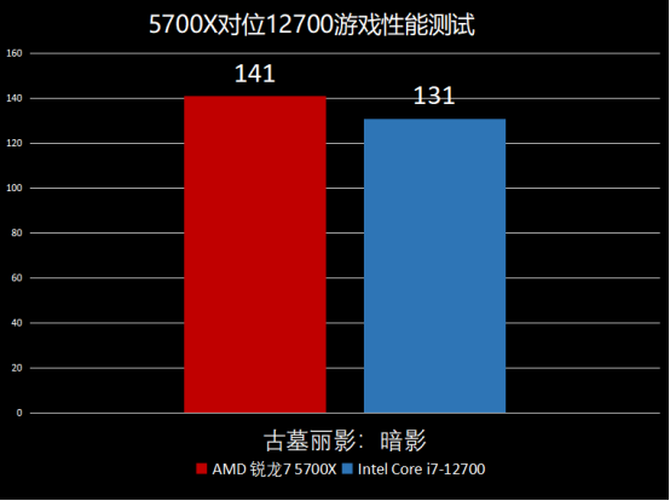 最后是经典的古墓丽影:暗影这款游戏,在实际的测试环节中我们可以看到在1080P分辨率,AMD锐龙7 5700X的游戏帧数为141,而Intel酷睿i7-12700的帧数为131,AMD锐龙7 5700X领先,可以看到,不论是在网络游戏还是3A大作表现方面,AMD锐龙 7 5700X都能够轻松胜任,并且还有较为明显的领先优势。