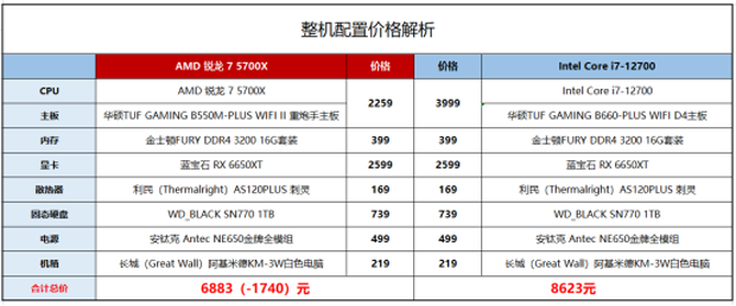 从配置单上可以看到,在除了CPU之外,其他配件保持一致的情况下,AMD整机平台的价格要比Intel平台少了1740元,这样的价格放在整套配置上,能够升级两档显卡、加内存或者硬盘都富富有余,同时在游戏性能方面,还要领先Intel酷睿i7-12700整机平台,对于没一毛钱都要花在刀刃上的学生党来讲,肯定是选择性价比更高的AMD平台更加明智!