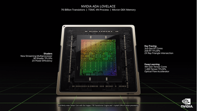 对于游戏玩家来讲,全新的RTX 40系列显卡在光追性能方面大幅提升,全新的RTX 40系列显卡核心代号为NVIDIA ADA LOVELACE,核心拥有第三代光追核心,光追性能有2-4倍以上的提升,那个是76billion晶体管,采用了全新的台积电4nm制程,在能效比方面有着大幅提升,同时显卡搭载了第四代AI核心,其深度学习能力提升非常明显,拥有1400 Tensor TFLOPS的性能表现。
