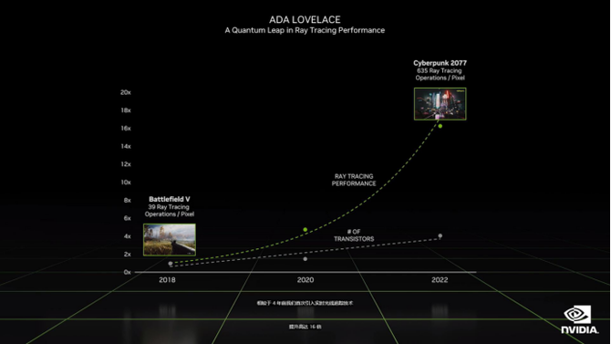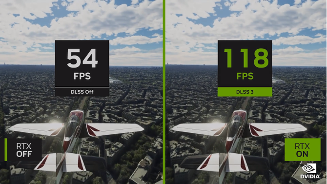 演示中,NVIDIA使用了模拟飞行这款游戏进行演示,在打开光追和DLSS 3.0之后,游戏帧数有了2倍以上的提升,经过3代的技术迭代,RTX 40系列显卡相对于初代RTX显卡,光追性能有了16倍的提升,并且深度学习能力也让我们的图形不断学习进化,提供更为优秀的画面表现。