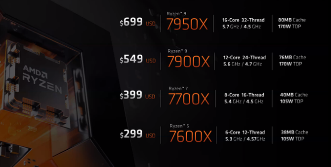 规格参数方面,首发的AMD锐龙7000系列处理器的型号一共4款分别为AMD锐龙 9 7950X,AMD锐龙 9 7900X,AMD锐龙7 7700X和AMD锐龙 5 7600X,对应的国行价格为5499元、4299元、2999元和2249元,和上代基本持平,其中旗舰型号的7950X相对于上代5950X有一定幅度的价格下调,价格依旧良心。