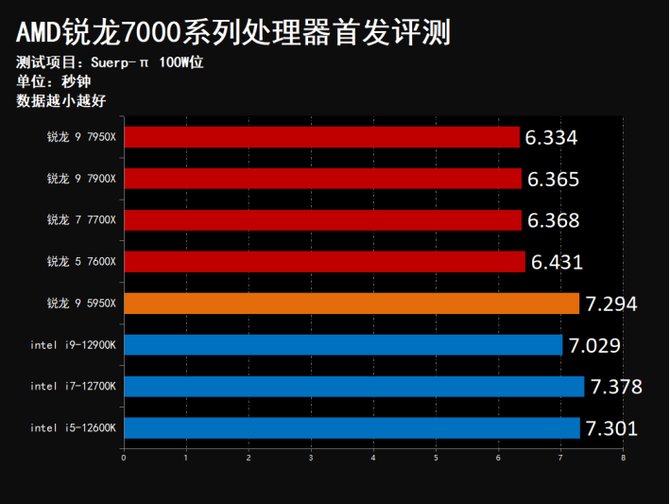 Super-π是一款测试处理器单核性能的测试软件,我们通常在测试的时候选择100万位进行计算,所用时间越少越好,在这项测试成绩中我们可以看到,AMD锐龙7000系列处理器的性能表现出色,基本都跑进了6.5s以内,大幅领先上代旗舰型号和Intel酷睿12代处理器的旗舰型号,单核心性能表现出色。