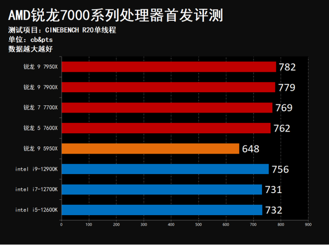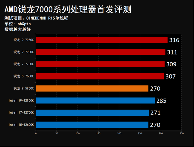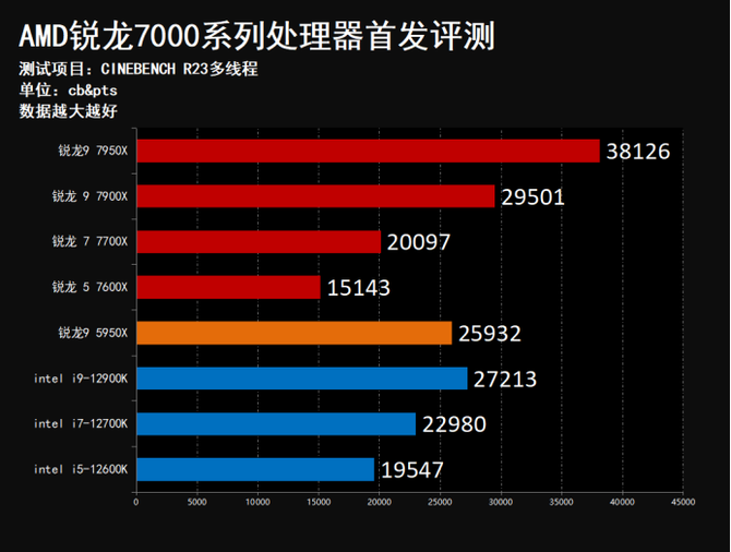 单线程性能表现方面,全新的AMD锐龙7000系列处理器的性能表现出色,从上面的基准性能测试可以看出来,在单线程性能方面,这一代的锐龙7000系列处理器凭借超5GHz的高频率,在单线程方面的性能领先上代5000系列旗舰型号,并且部分领先Intel12代酷睿处理器,同时4款锐龙7000系列处理器的单线程性能极为接近,如果你对于单线程性能应用有高要求的话,那么这一代的锐龙7000系列处理器就非常棒。