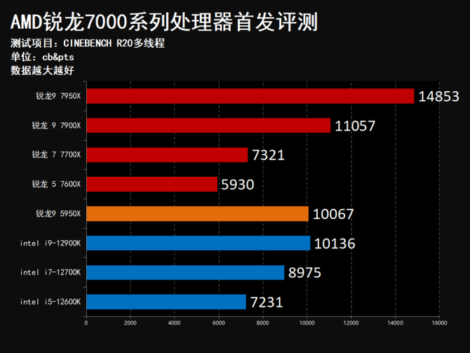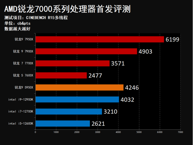 一来到多核基准性能测试之后,立马就进入了AMD的舞台,多核性能表现方面,AMD锐龙 9 7950X的R15多核性能领先上代5950X约45.9%,R20则为47.5%,而R23则为47%,多核性能提升非常明显。相应的AMD锐龙 9 7950X的R15、R20、R23多核性能领先分别Intel酷睿i9-12900K约为53.7%、46.5%、40.1%,多核性能有着无可撼动的领先优势,但是入门级的AMD锐龙 5 7600X的多线程性能则没有领先与之对位的i5-12600K。