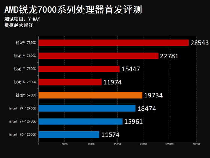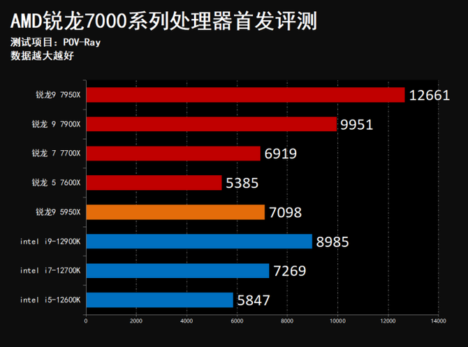 内容创作和媒体处理方面,AMD锐龙 9 7950X凭借优秀的多核性能表现,在内容创作上获得突出的性能表现,在POV-Ray和V-RAY这两个测试项目中,渲染成绩都非常不错,并且入门级的锐龙5 7600X表现也可圈可点,对于专注于内容创作的用户来讲,这样的成绩表现能够让我们的创作效率更高,大大缩短没必要的等待时间。