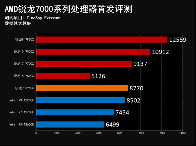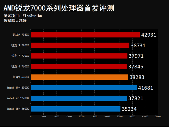 3DMARK测试项目是我们经常用来测试整机硬件水平的基准测试软件之一,在这个项目中,我们可以看到,在FireStrike测试项目中,AMD锐龙7000系列的处理器的DX11和DX12性能非常出色,大幅领先上代5000系列处理器,但是FireStrike的物理成绩则相差不是大,但是在TimeSpy Extreme测试项目中,AMD锐龙 9 7950X领先12代酷睿i9-12900K约47.7%,性能领先幅度非常大。