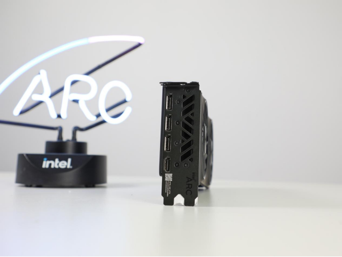 输出接口端,为了和整体保持一致性,同样做了熏黑喷漆的处理,在接口方面,Arc A770和A750提供了1个HDMI 2.1接口和3个DP 2.0接口,能够轻松满足用户组建4联屏,日常使用完全足够用。