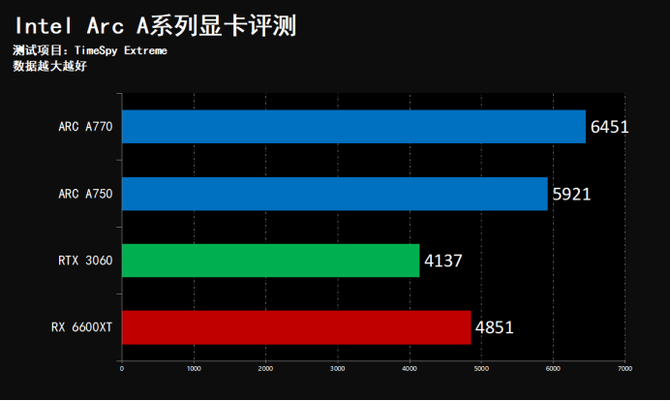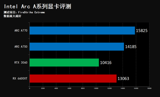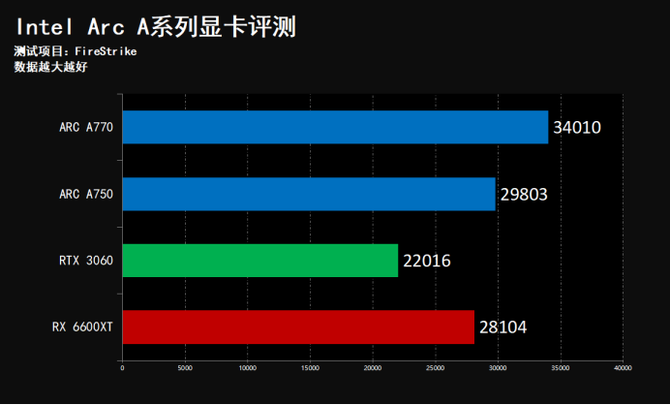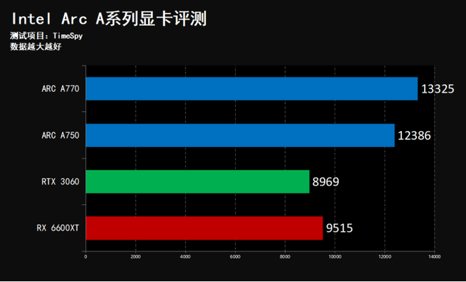 经过我们的实际测试可以看到,在FireStrike这项成绩当中,Intel Arc A770领先A750越14.1%,领先NVIDIA RTX 3060约54.5%,在TimeSpy DX12游戏基准测试中,基本保持同样的性能领先幅度,这样的性能表现,是大幅度、跨级别的巨大领先。