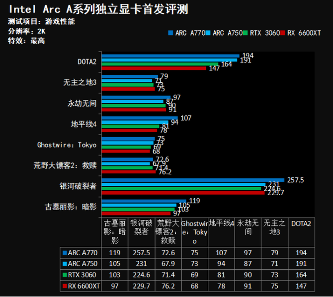 在2K分辨率下,Intel的Arc A770和A750均能在2K分辨率下流畅运行各种游戏,同时并且两款显卡在游戏性能方面的表现均略微领先RTX 3060显卡,对于大部分游戏玩家来讲,Intel这两款显卡购买入门级的A750显卡在游戏方面性价比更高一些。