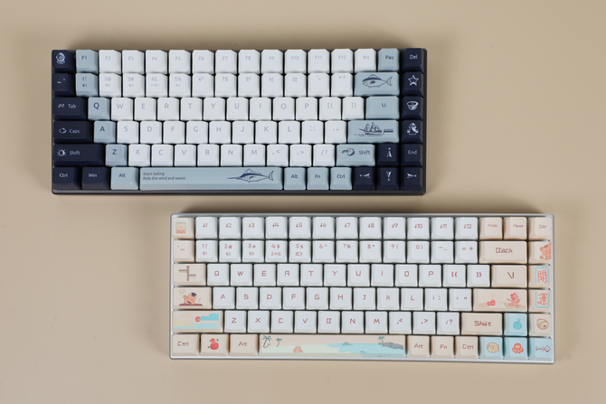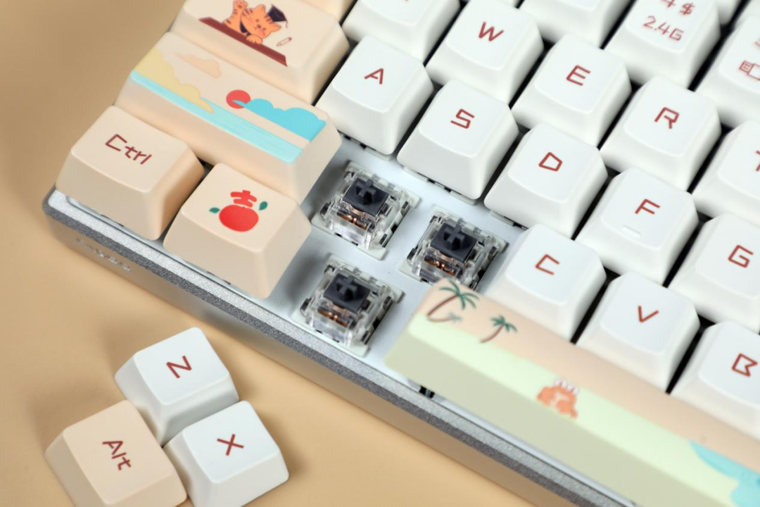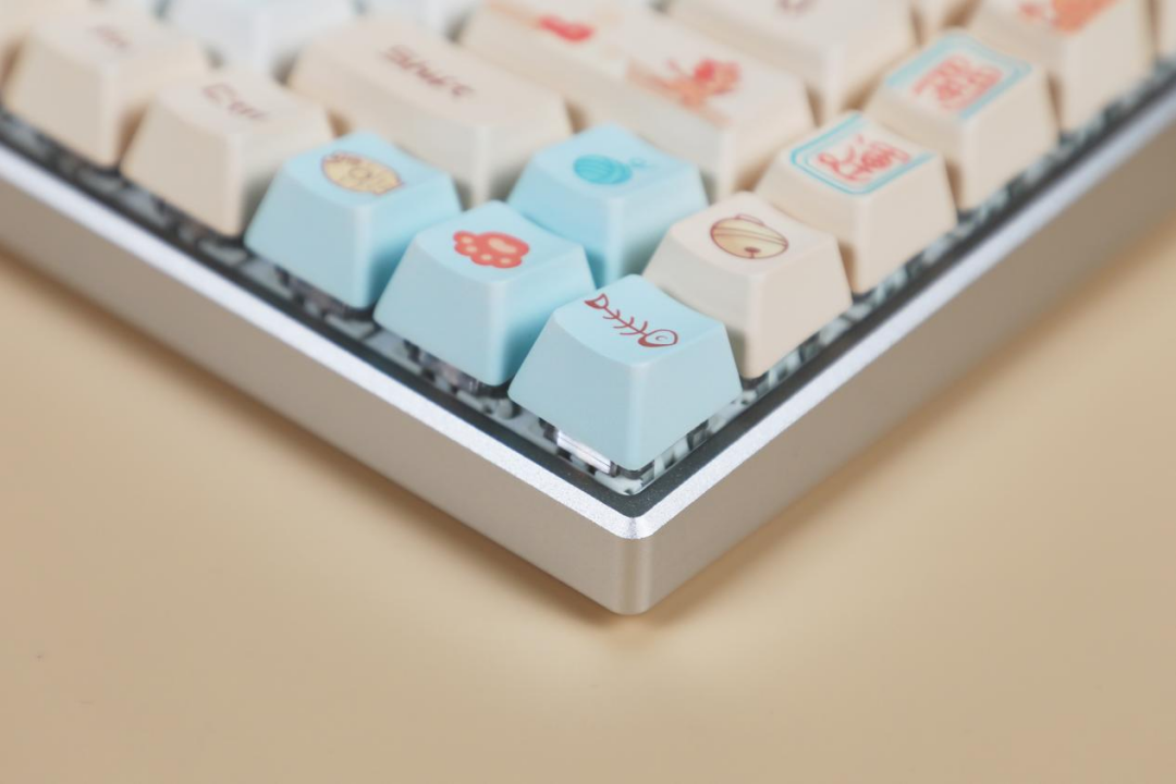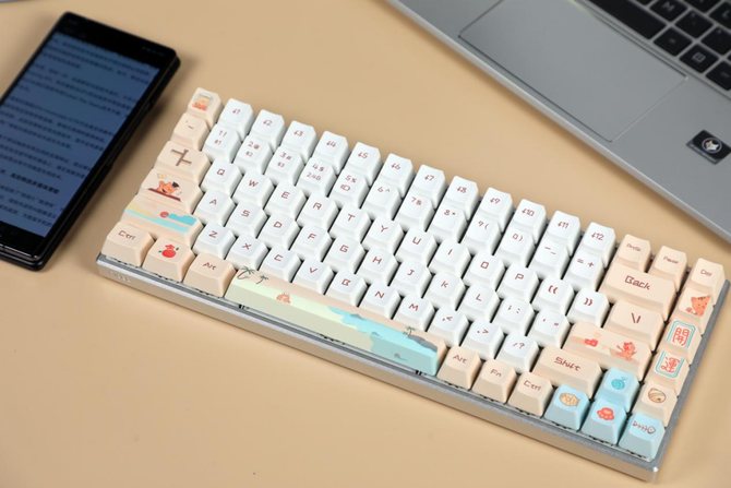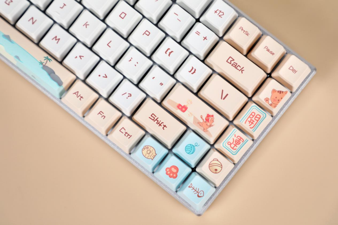 配色方面,雷柏MT510PRO提供了航海日记和喵喵假期两款键帽,其中喵喵假期款非常可爱呆萌,并且键盘的键帽整体设计的非常用心,做工非常好,沁染地非常细腻,并且键帽上的很多图案都非常可爱,让人爱不释手。