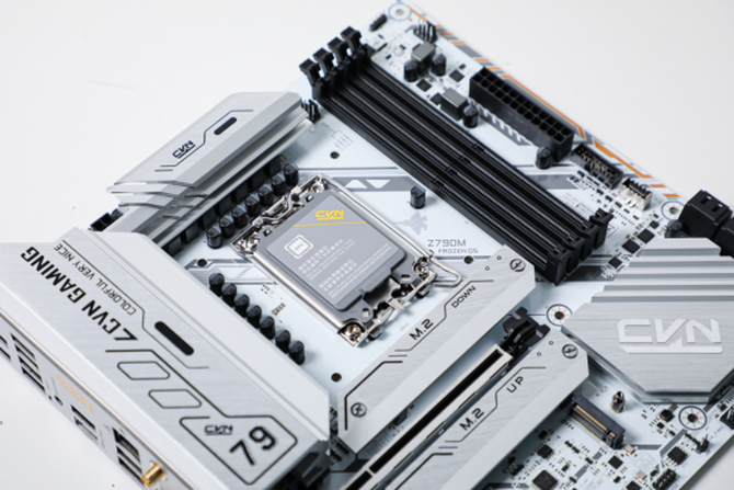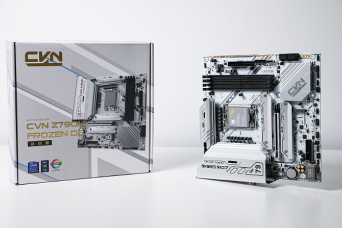 本次七彩虹CVN Z790M FROZEN D5 V20主板采用了全新的Z790芯片组,兼容12、13代酷睿的LGA1700针脚的处理器,并且依旧延续了家族式的寒霜散热装甲,酷冷的白色机甲风看上去非常酷炫,并且从型号大家也能看出,这款主板支持DDR5内存,最大频率可以达到6400MHz。